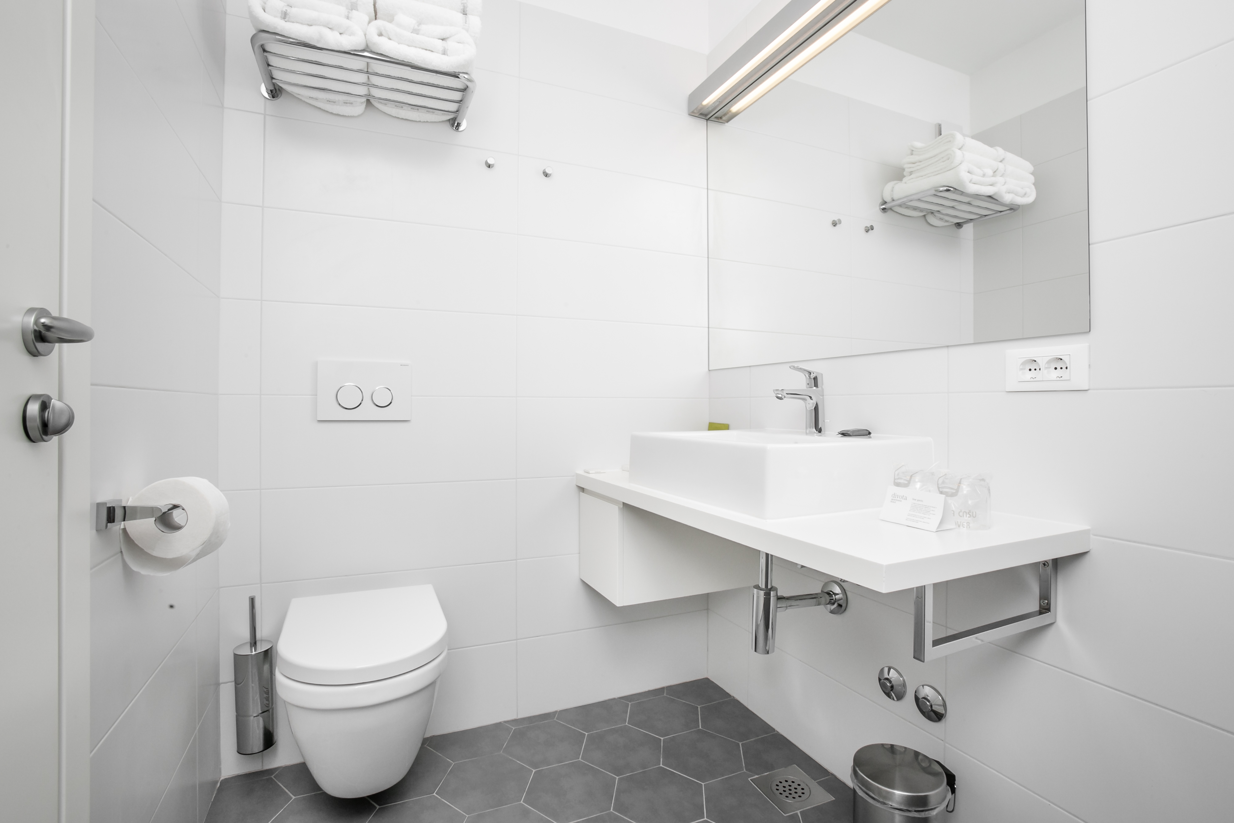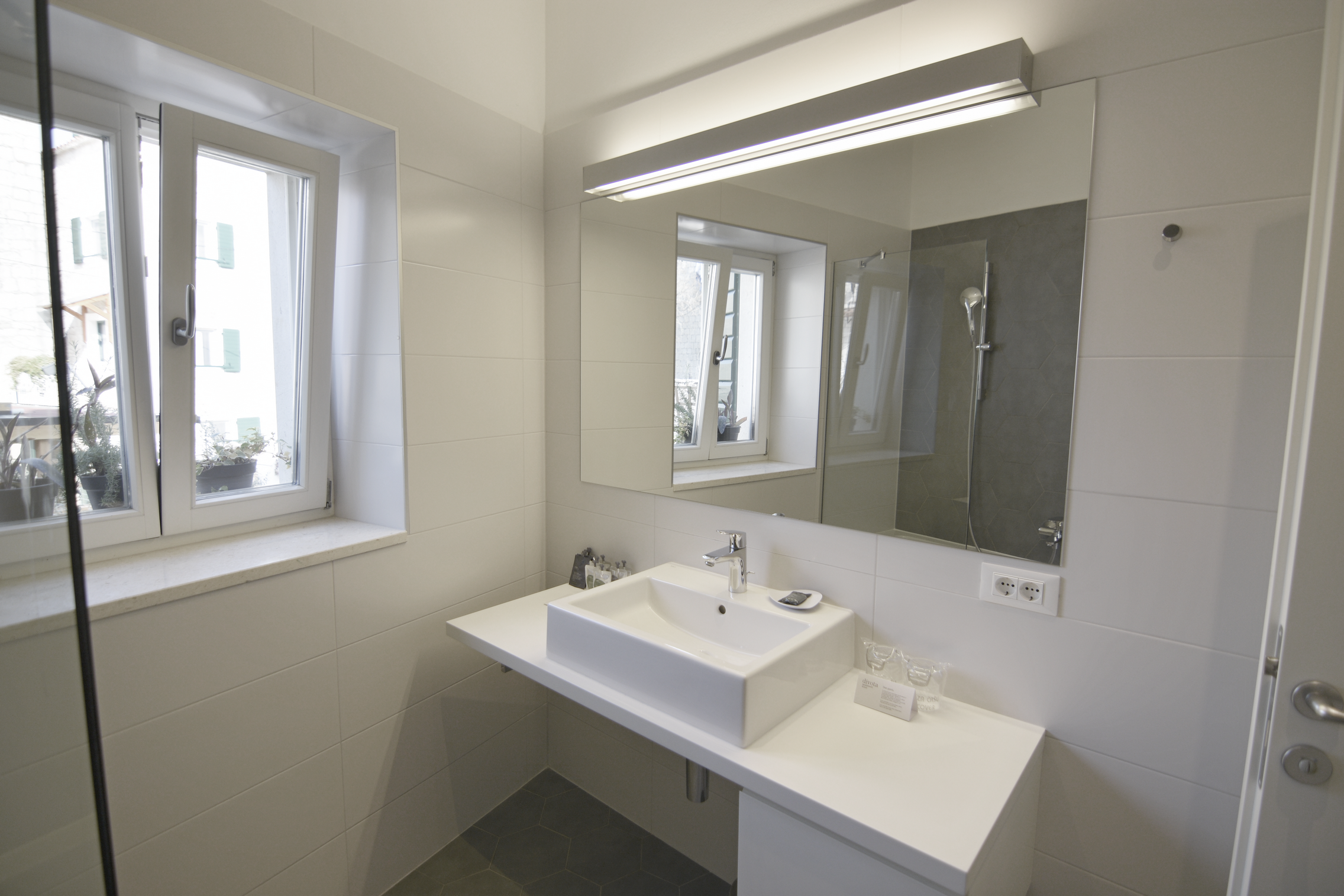 Book NowBright double room above Divota’s reception in a traditional Dalmatian house, with a private balcony overlooking Varoš’s stone-paved streets.