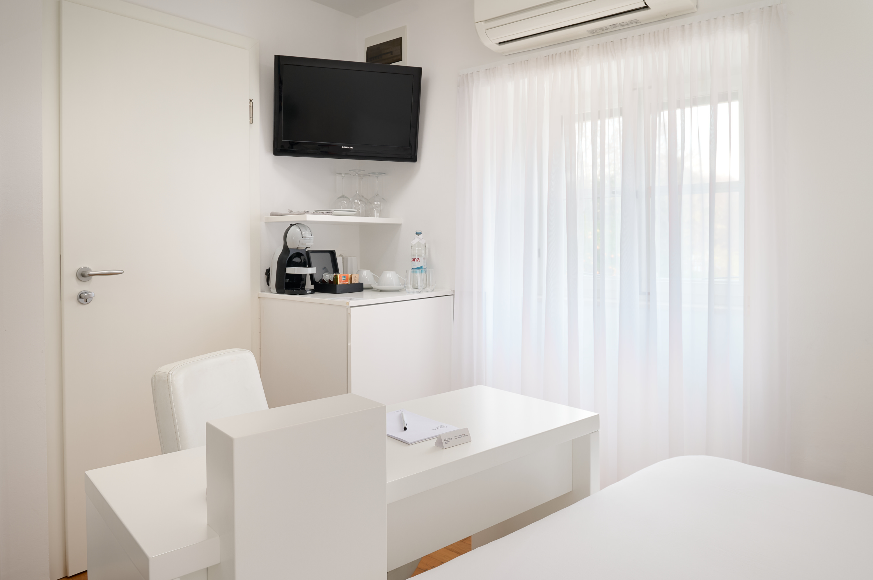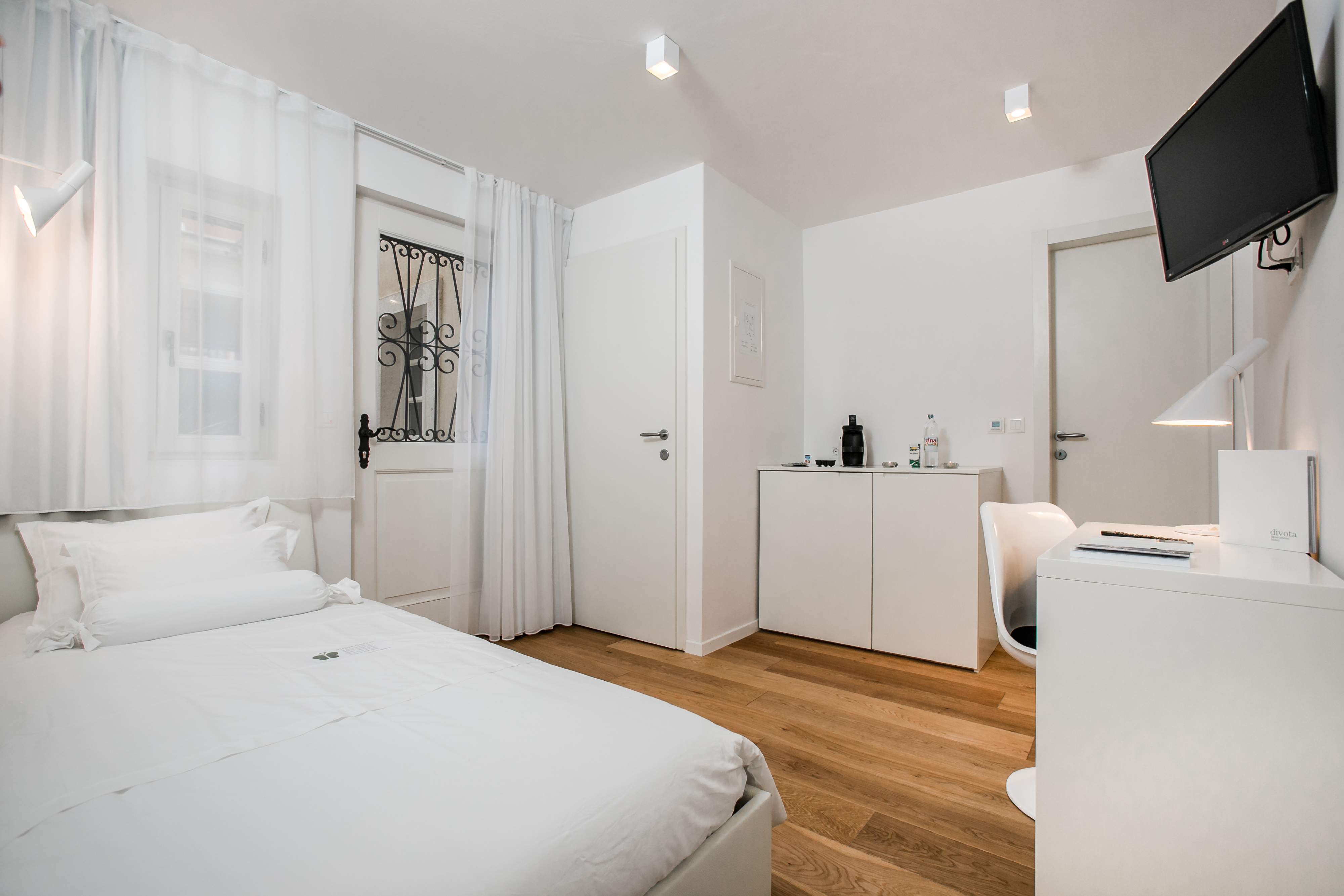 Bright double room above Divota’s reception in a traditional Dalmatian house, with a private balcony overlooking Varoš’s stone-paved streets.
